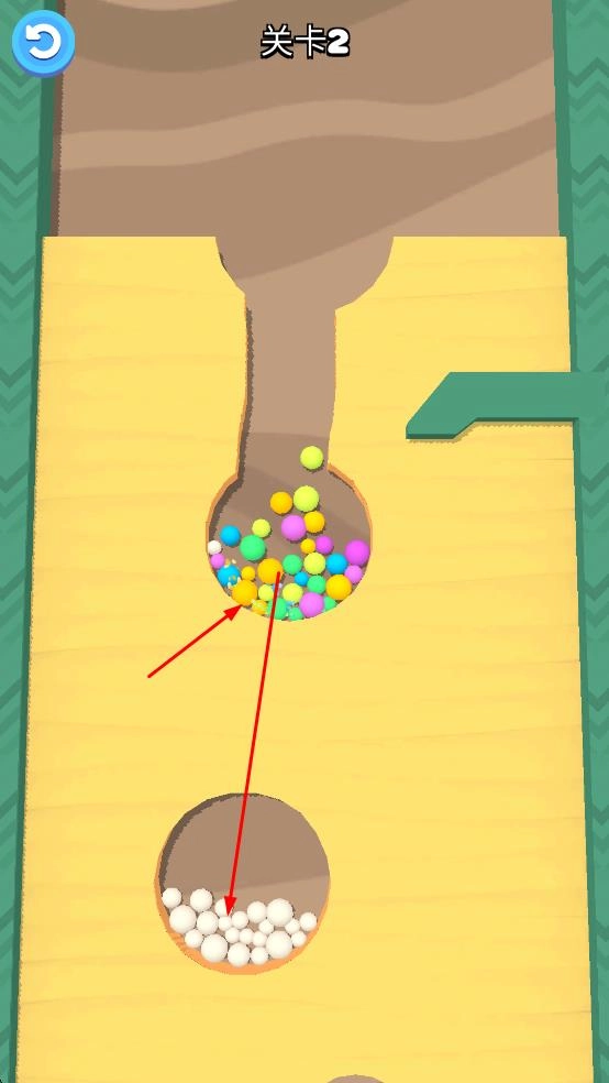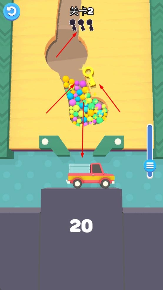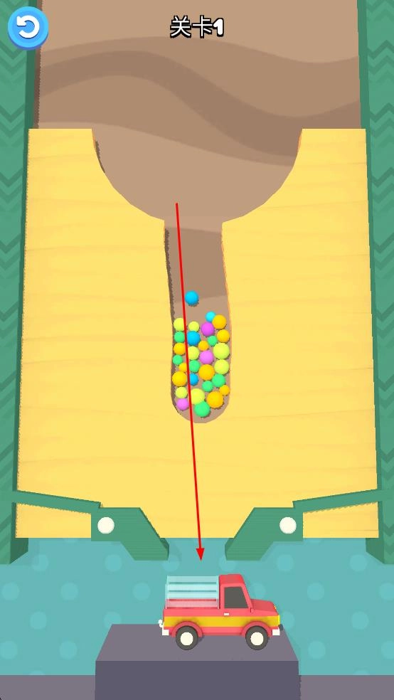 1、在关卡1和关卡2中,操控彩色球体从上方掉落,通过引导球体进入下方的红色卡车中。