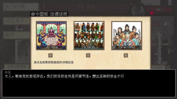 3、深入了解游戏后,整个国家的自理与发展离不开:政策管理、法律制定、战争策略、剧情任务等。