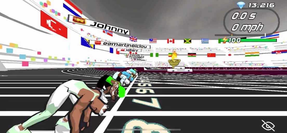 百米赛道设有预赛和决赛,一旦抢跑,将直接被红牌罚下。在雨天时,场地的抓地力会有所降低。全球排行榜依据大洲进行划分,亚洲区的记录单独统计。每周排名前一百的选手能够获得虚拟奖牌。