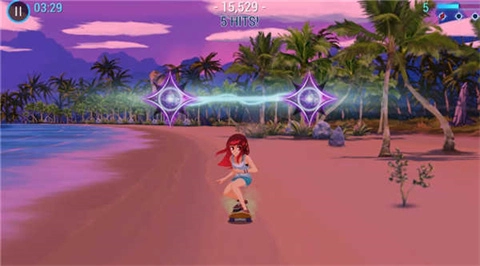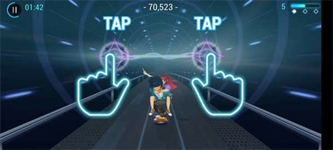 4、玩家还可以通过闯关观看整个故事的表现,带有跑酷元素的音乐游戏,并且融合歌曲和经典跑酷元素,通过滑板在各种场景中躲避敌人的追击,收获全新的音乐挑战。