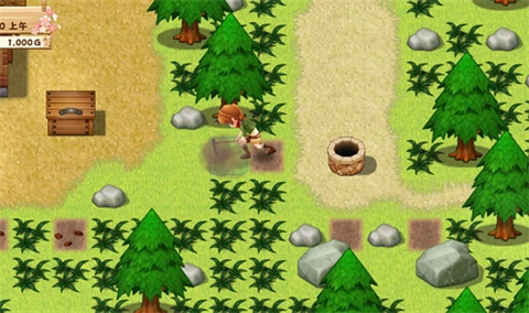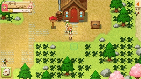 这里我想说玩过牧场物语的玩家都知道夏季作物无法在春季种植,这游戏就不一样了。激活第二块石板商人开始贩卖夏季作物啦,买番茄+玉米+青椒等~~春天照样种,这里升级道具需要的花就不需要等了马上买上20个以上向日葵种上,最好身上留个1千块+80以上卷心菜第七天开始挖矿了。