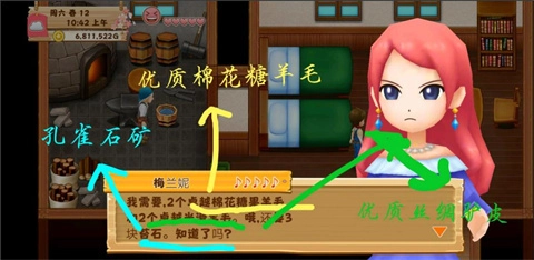 关于结婚需要的材料,这个是汉化的锅。需要【优质棉花糖羊毛】x2,【优质丝绸驴皮】x2,【孔雀石矿】x3。【棉花糖羊】和【丝绸驴】是通关之后增加的新品种,可以买。