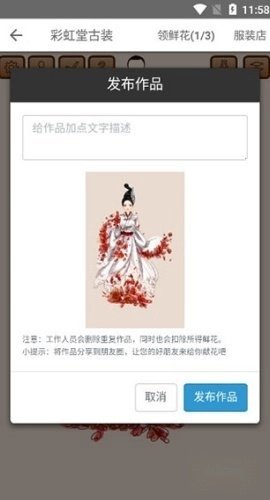 10、换装完成后,点击左上方的“√”按钮予以发布,同时添加文字描述。