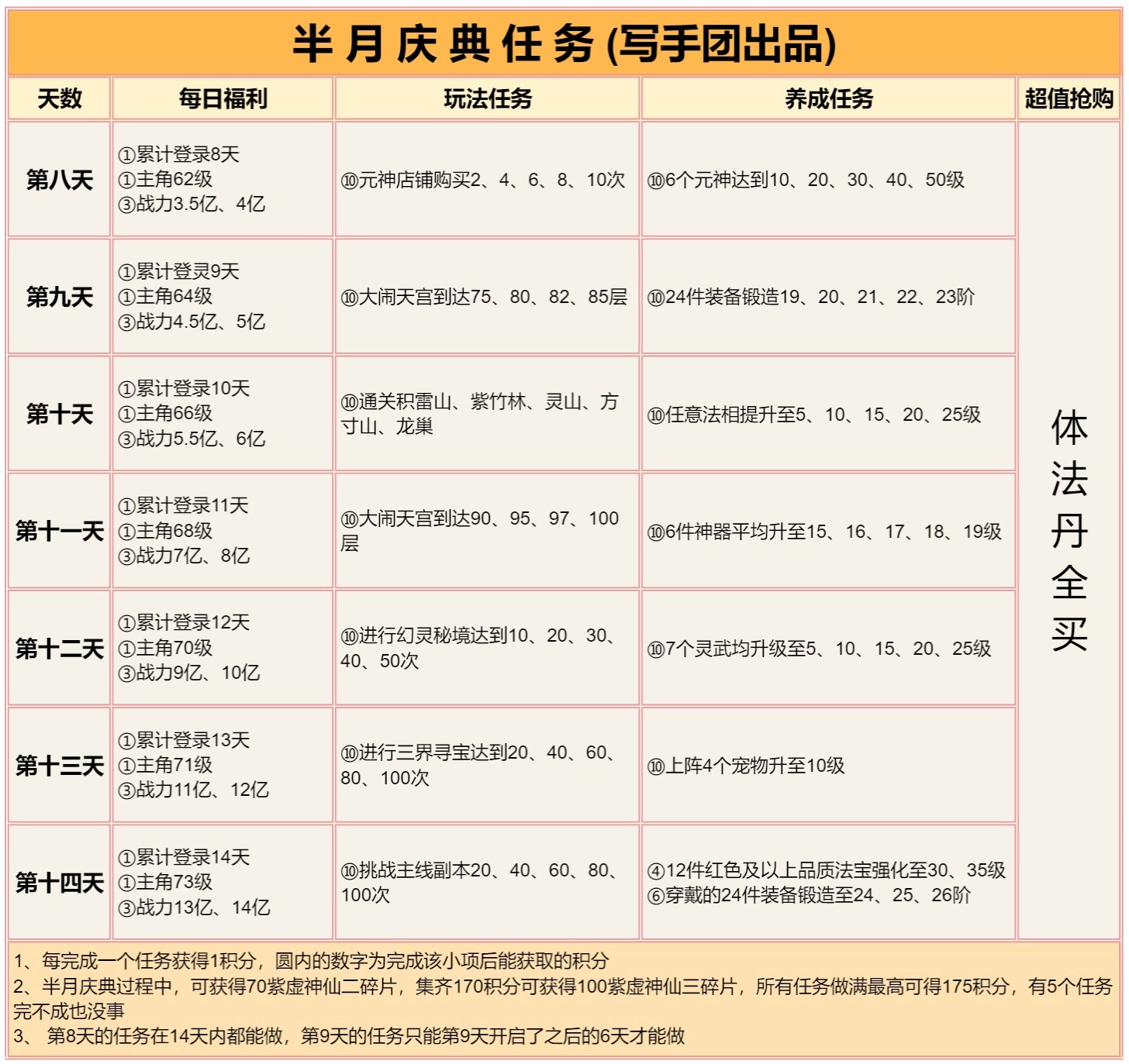 这款游戏的新手村阶段时长为10天。在这10天里,无论是零氪玩家还是首充玩家,元宝仅用于以下四个地方:在商城将体法丹每日购买量拉满,同时购买10个除魔令,还有某些玩法的次数以及vip礼包。除此之外多余的元宝,全部存起来,留待出村后有活动时再使用。