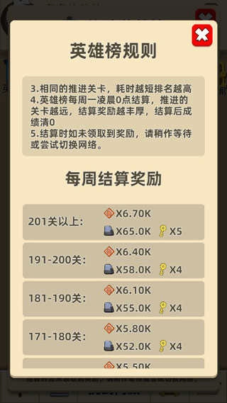 4、英雄榜于每周一凌晨0点进行结算,玩家推进的关卡距离越远,所获得的结算奖励就越为丰富。结算完成后,成绩将重置为0。