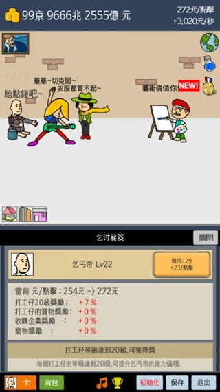 2、获得的钱就要升级乞丐等级,不停的进行升级,升级等级越高,每次点击就会获得更多的钱。
