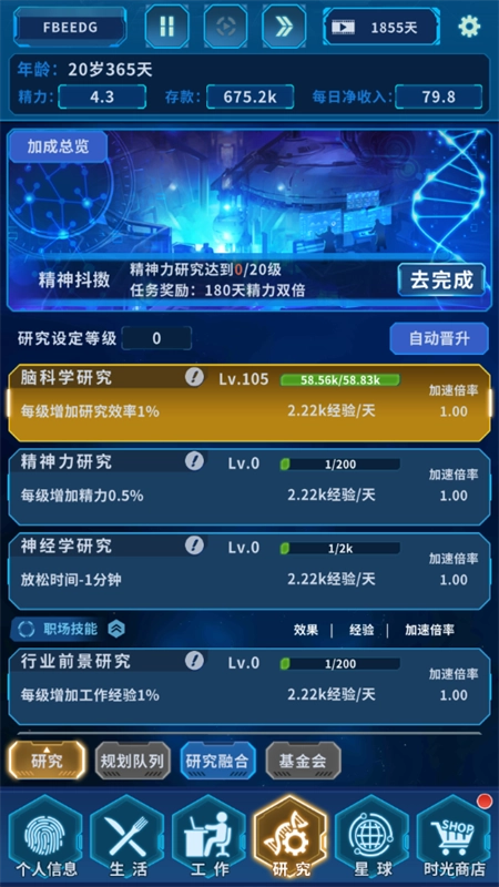 4、在研究界面下,我们能够研究各种数值,能够对自己的整体获得加成。