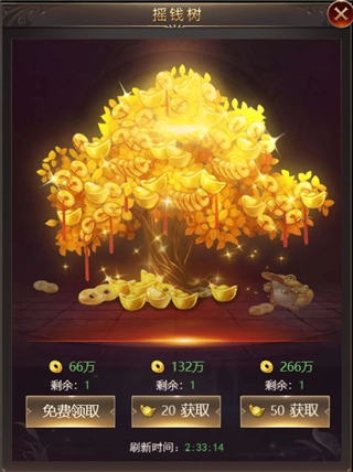 这是该游戏独具特色的玩法之一。在主城界面,点击铜币金额后的“+”号,接着点击摇钱树即可进入。通过摇钱树,玩家能够获取大量铜币。每日会更新重置摇钱树的次数,VIP等级越高,可摇的次数就越多。务必牢记这一点,因为这不仅是获取铜币的主要途径,更是最快的方式。