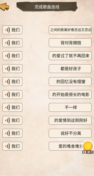 1在进行歌词连线之前,要先完整地聆听音乐,重点抓住副歌部分的关键旋律和关键词,通过这种方式能够快速锁定匹配选项,进而提升连线的准确率。