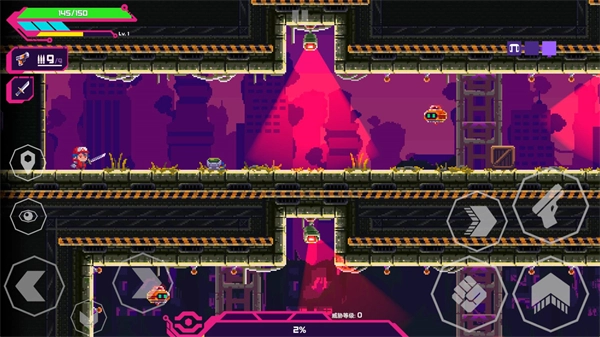 3、闯关时,成功击败敌人能够获取经验与金币,而一旦被摄像头照到,警戒度就会提升。