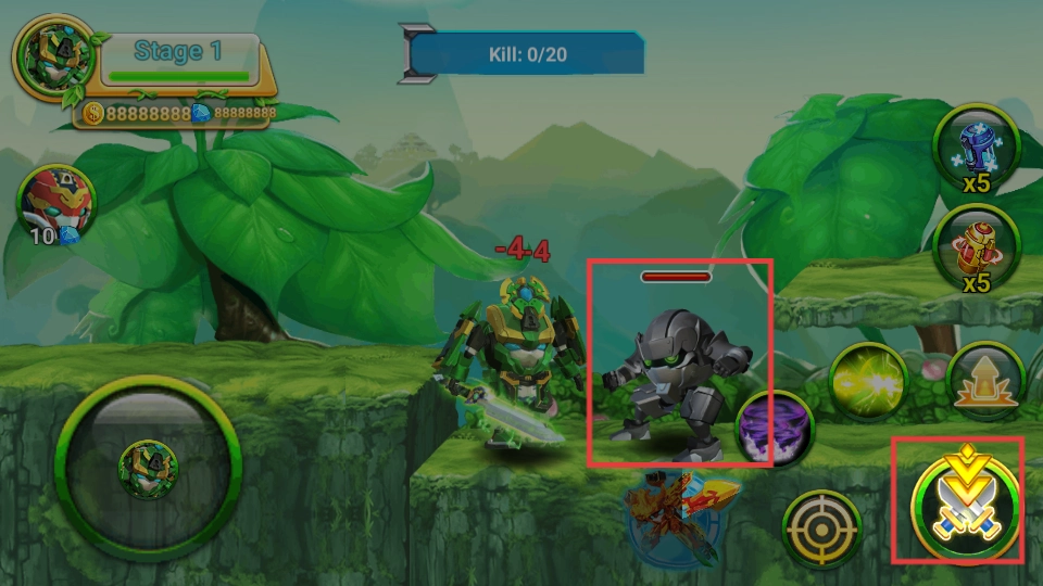 2. 操控机甲类角色,点击右侧所设技能,对灰色外观的机甲敌人展开攻击。