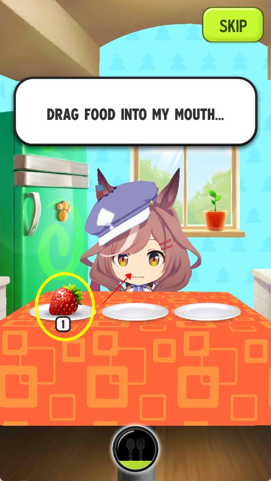 3、将盘中的食物拖曳至曼波的口中,进行喂食。