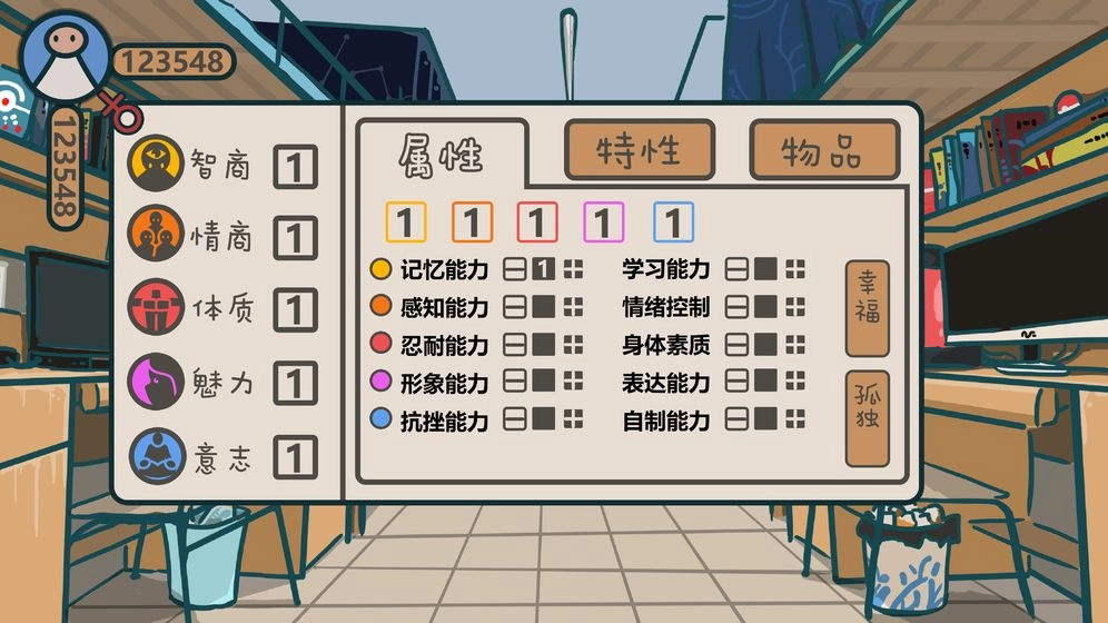 感情:在游戏里感情一共分为三种,分别是友情、爱情和亲情,它们都是你的情感来源,你需要维护好与你的情感来源的关系,良好的感情会给你诸多增益,如跟父母关系好父母时会获得额外的零花钱,而崩溃的感情则会对人物造成丧失精力,染上恶习等负面效果