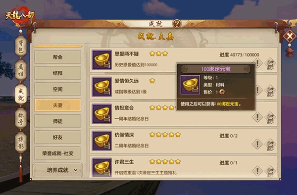 2、你有伴侣么?你有师徒么?你有朋友么?这夺命三连问一度曾是小编的痛(现在也好不到哪儿去),不过咱天龙江湖的很多少侠,那可真是胜友如云夫妻情深。这不,最适合你的成就任务,千万别错过。