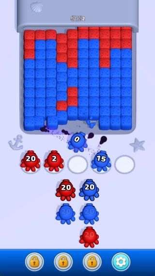 1、挑选不同颜色的章鱼作为操控主体,章鱼颜色与墨水颜色直接对应,让章鱼快速射击各个方块。