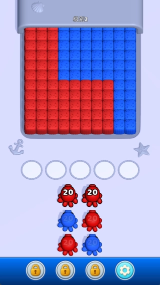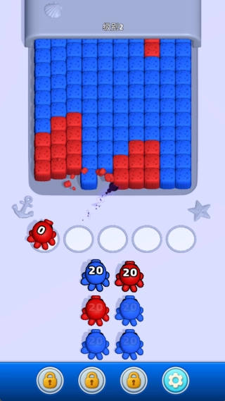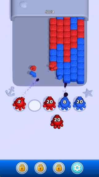 4、消耗所有的章鱼来完成关卡任务,最后不能剩余任何方块,玩家要使用合适的顺序进行消除。