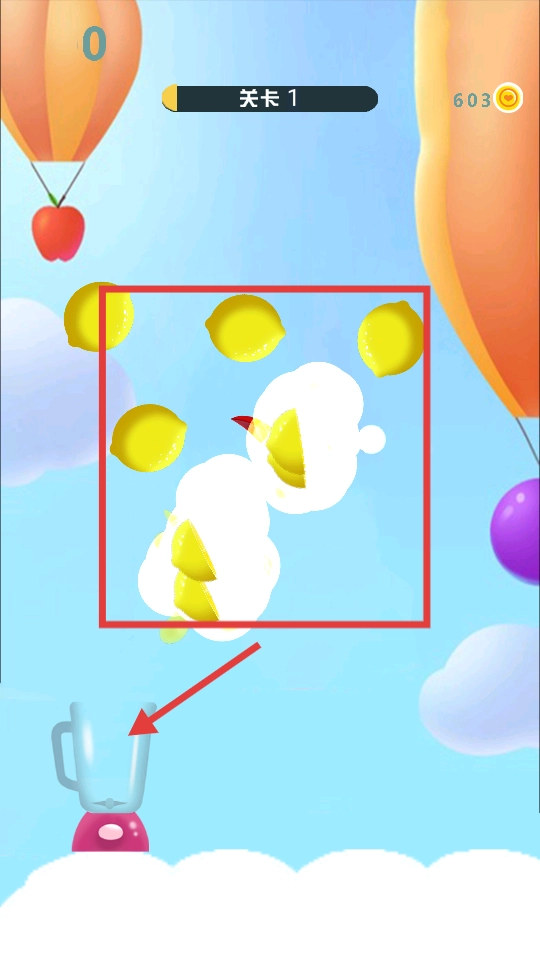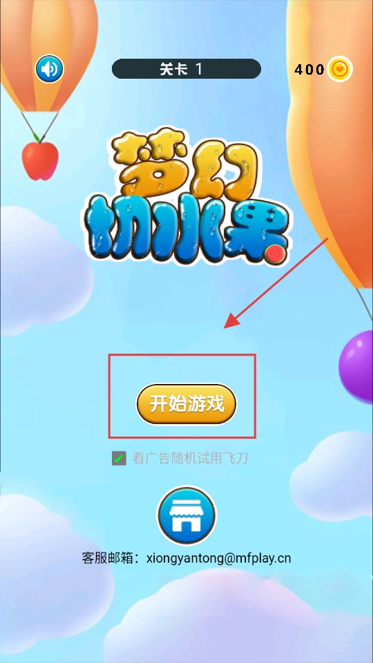 1、点击开始游戏,进入关卡,屏幕上会出现各种水果,通过滑动等操作,用刀具切割水果。