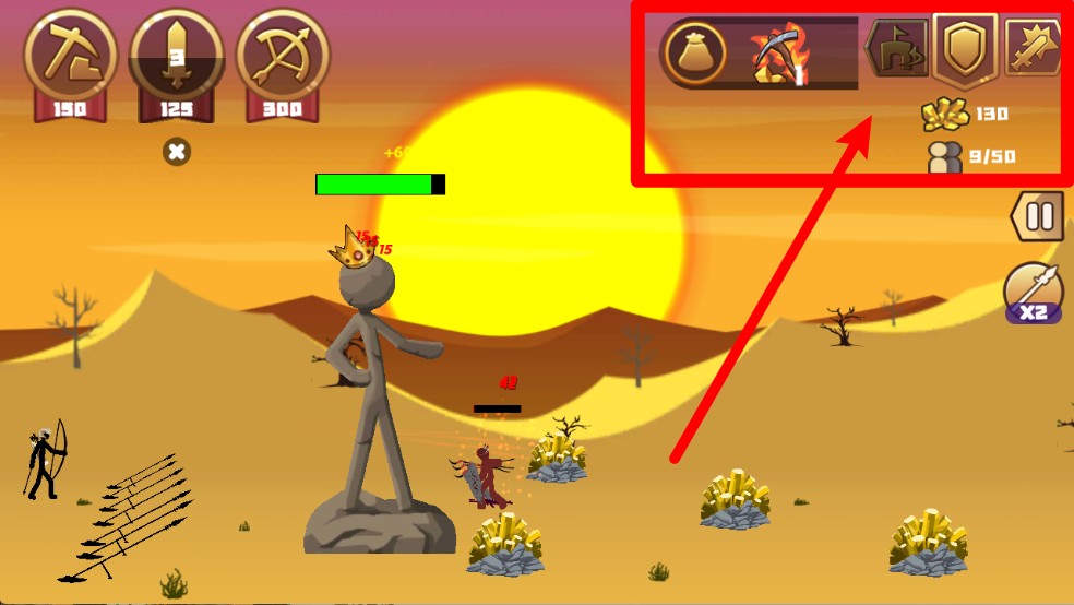 1.资源采集调控:点击界面右上角的图标能够快速切换采矿模式,科学分配矿工以增加黄金产出,保障部队建设持续进行。