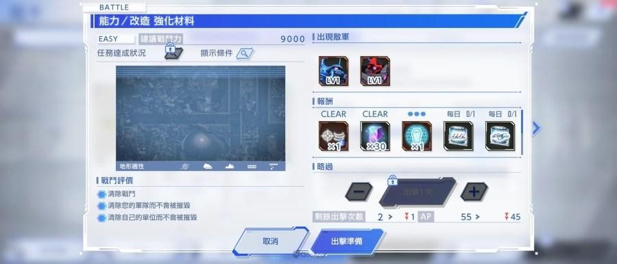 游戏中有一种特殊道具,即便仅靠通关普通关卡也能积累经验升级,但专门针对它设计的关卡奖励更丰富——这里不仅能拿到提升等级的经验道具,还有强化角色能力、改造所需的材料,以及增加角色数值的训练点数、升级可选零件的专属强化材料,和游戏通用货币这五种资源。这类关卡每天每个只能挑战三次,为了囤积足够资源,建议把次数用完。