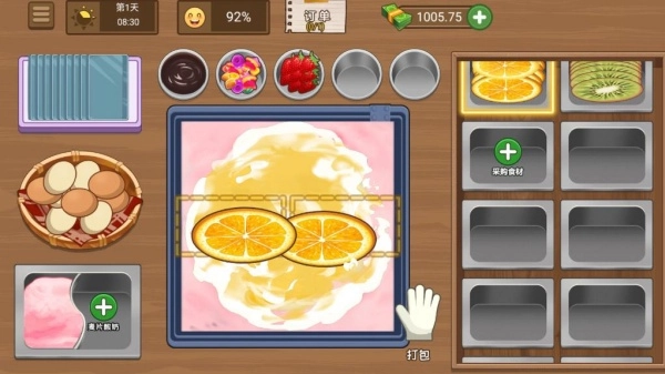 4、完成后就放入客人之前要求的橘子片,接着点击右下方的打包按钮即可,尽量加快速度,毕竟顾客的耐心是有限的。