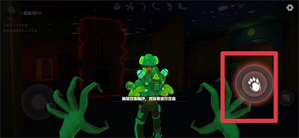 2、遇见玩家时,通过点击攻击摇杆对玩家进行攻击,同时你还有专属技能可以释放,释放后更有利于你抓捕幸存者