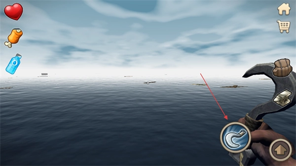 4、确认瞄准目标后,点击界面右侧的抓取按钮,即可利用钩子捞取海面的漂浮资源,并将其收集至背包中,这是获取初始生存物资的核心操作。