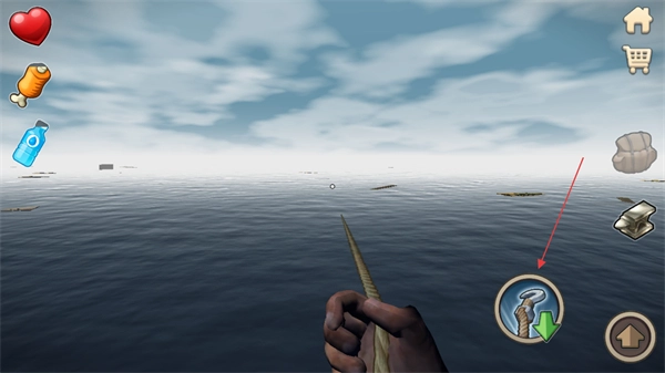 2、进入生存场景后,点击界面右侧的钩子图标,即可切换至开局配备的核心工具——钩子,该工具是开局收集海上漂浮资源的唯一装备。