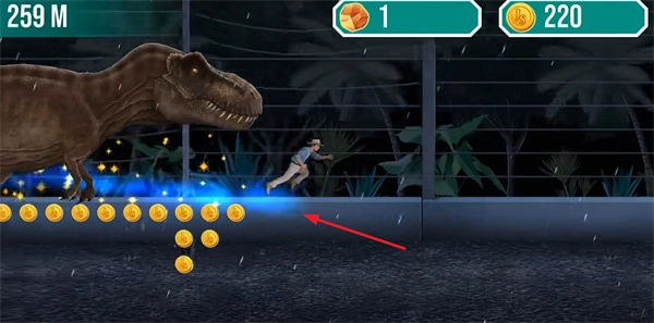 1、选择好一个角色,可以是恐龙,或者是人类,然后就能自动向前奔跑,前方出现一个恐龙,可以往下滑动,就能收集里面的金币。