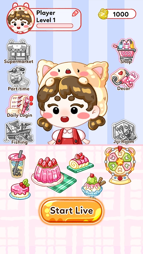 4、萌趣卡通画风:运用色彩鲜亮的卡通风格,主角吉吉被设计成夸张的大头模样,配上动物造型的帽子、会闪烁的甜品等萌系元素。满屏的粉色特效与精致装饰共同打造出梦幻感十足的氛围,对低龄女性玩家有着特别的吸引力。