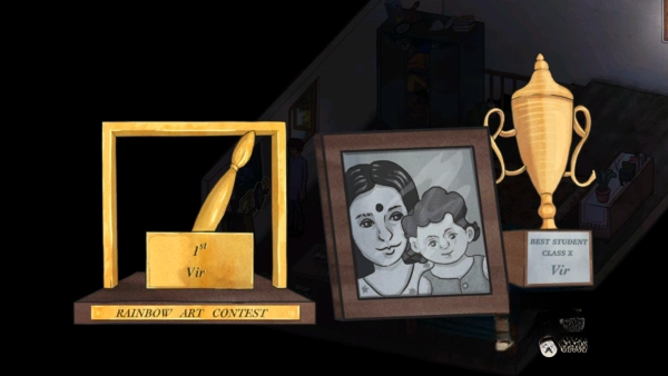 2、进入游戏后,跟随剧情在房间内探索,床头有一张与妈妈的童年合照。