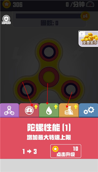 3、还能用金币给陀螺升级,以此提升它的性能、润滑度等各项数值,让它运转得更持久