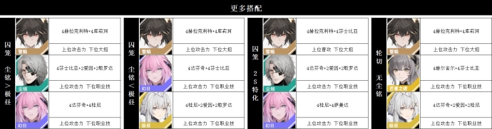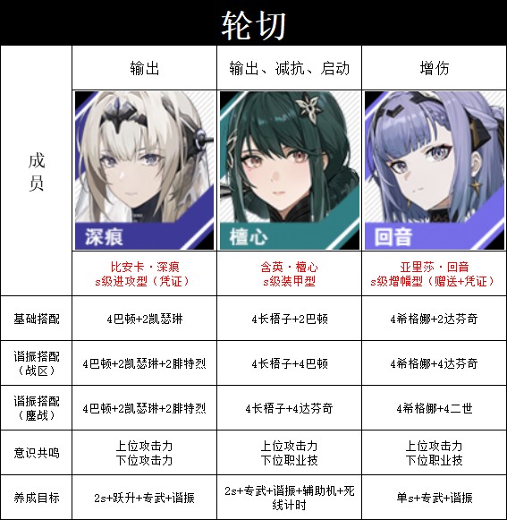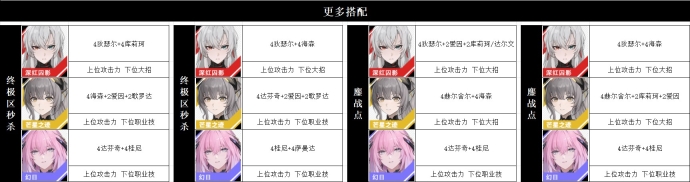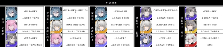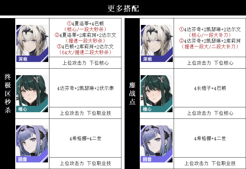 在长线作战的情况下,檀心会带着库莉珂来确保续航能力,而回音则会携带4个希格娜以提供高额的暴击率加成。