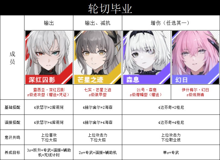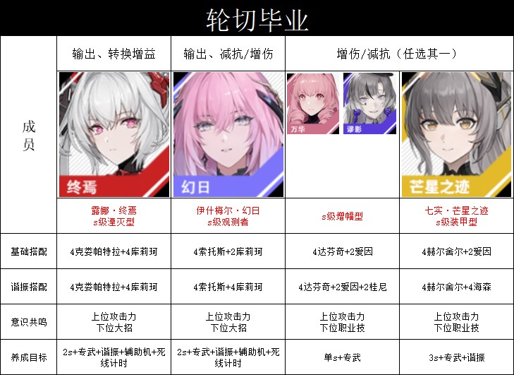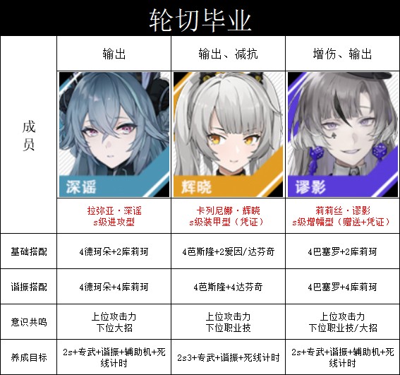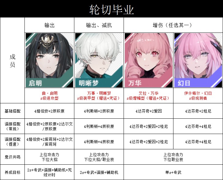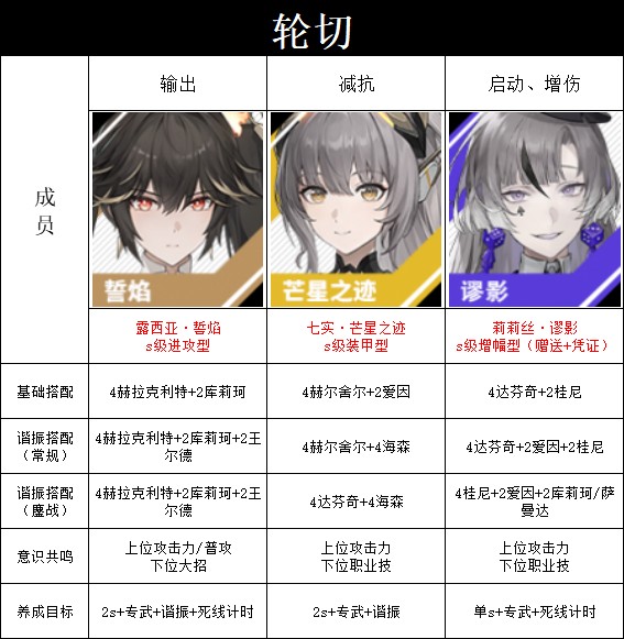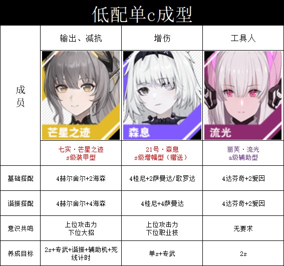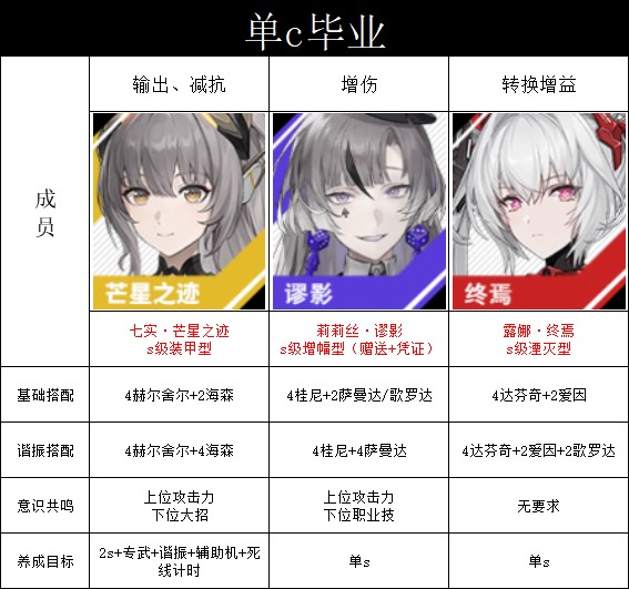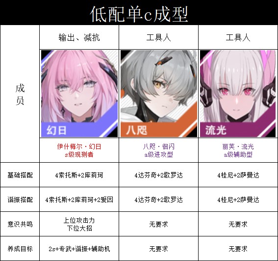 本文主要是为了让萌新快速掌握阵容与意识的搭配逻辑,每个队伍通常会提供三种搭配方案:①低配单c成型、②轮切毕业、③更多搭配,部分极端情况下的意识搭配未被纳入其中。轻度玩家只需关注“成型”和“毕业”这两个板块,“更多搭配”里收录了一些竞速或特殊搭配,感兴趣的话可以了解一下。