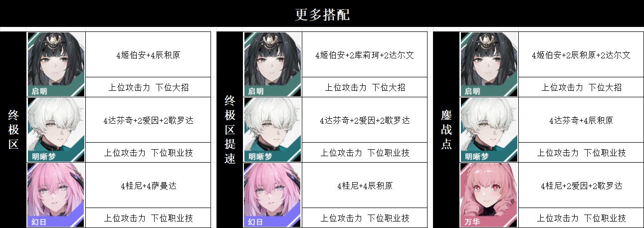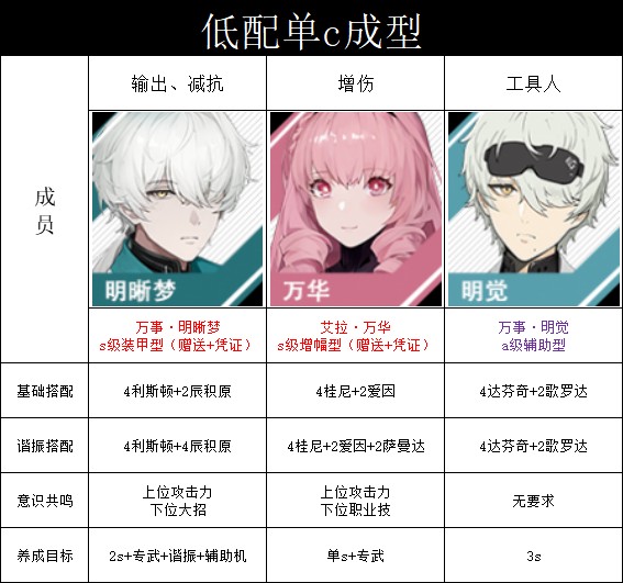 明晰梦的循环体系能量充足,不需要携带库莉珂,直接用4辰积原就能获得高额加成,还能空出辅助的意识格子。而且明晰梦本身作为装甲角色具备减抗能力,搭配万华或明觉就能集齐冰队体系所需的buff,第三个位置可以任选成员来承担意识和武器共鸣的触发任务。