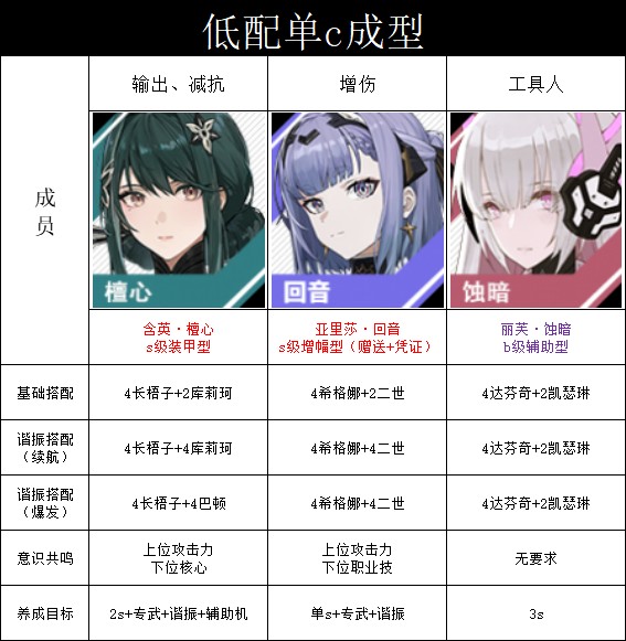 檀心同时具备减抗与输出能力,檀心搭配回音的组合,已形成输出、减抗、增伤三者兼备的队伍框架,第三人只需携带意识触发器就行,若自身还有额外增益则更理想。可以选3s蚀暗(能提供后台10点物伤,属于独立词条,可与回音叠加),或者任意带武器共鸣的装甲类/增幅类角色。