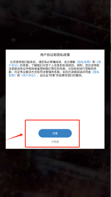 1界面采用深色基调,中央的白色区域展示着用户协议与隐私政策相关内容,底部的蓝色确认按钮被醒目地标注为红色,只有点击该按钮后才能进入游戏。