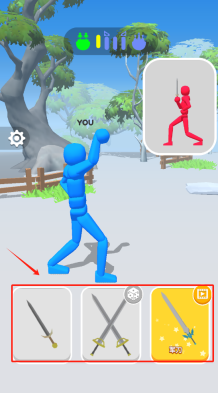 2画面中央是蓝色火柴人,其旁的红色火柴人持剑摆出战斗姿态。画面下方有三个武器图标,其中黄色的是军刀,需从中选择一个进行装备。