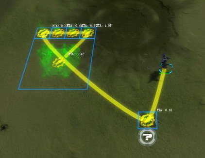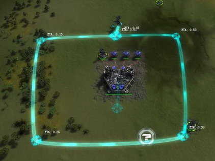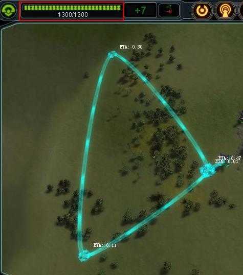 现在我计划让ACU回收这些树木并转化为资源,但一颗一颗点击树木会不会太繁琐?宝贵的时间岂不是都浪费了?别担心,我有个“一网打尽”的办法。选中ACU后,按住[Shift]键再按下[P]键,接着像图里展示的那样设定回收范围——这样ACU就会沿着蓝线移动,并且在自身可视范围内(不只是设定的圈内树木)自动回收树木。需要注意的是,要是你的资源已经满了,ACU就只会沿着线路巡逻,不会进行树木回收。 这个方法的应用场景还不止回收资源:你可以用同样的步骤,让工程车或ACU在基地周围巡逻。在巡逻过程中,它们会自动完成回收资源、修理受损单位等多项任务,具体效果可以参考下图。