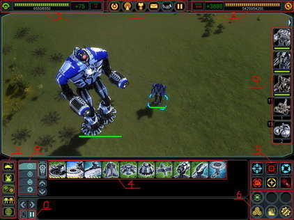 请看上方的图,现在已选中ACU,并出现了建筑菜单,下面是图中标记的说明: