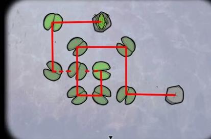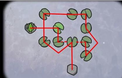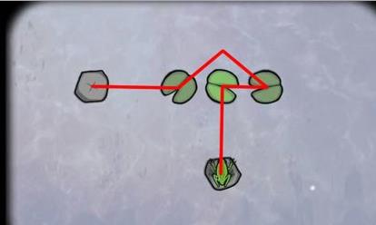 1、调查青蛙,然后控制青蛙跳过每一片荷叶落到石头上,5次以后得到第一只青蛙;