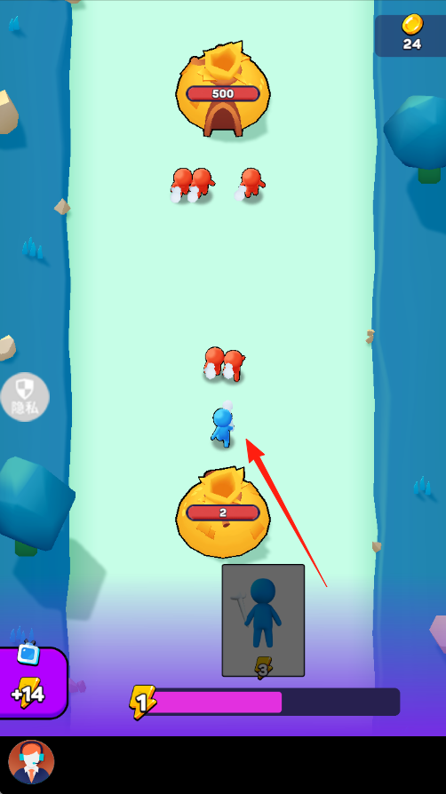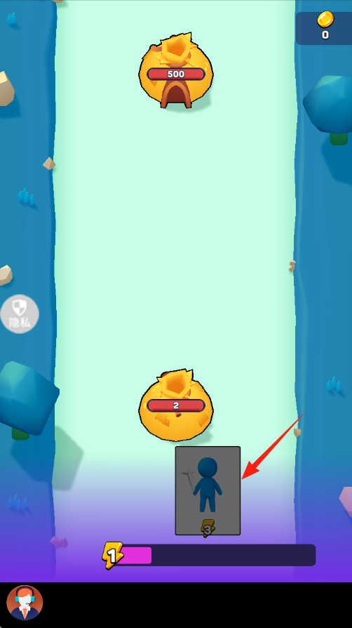 1、操控蓝色小人,目标是攻击上方血条值为500的建筑;下方建筑的血条值为2,该建筑可生产初始单位——蓝色小人。