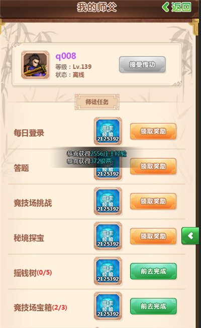 3在正式确立师徒关系后,徒弟完成特定的师徒任务能够获得丰厚的奖励。此外,师傅还可以通过传功的方式,将自己的部分经验值转移给徒弟,助力其成长。
