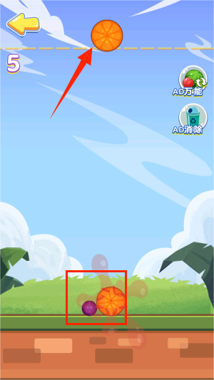 3、顶部横线上显示的是水果,点击该水果就能让它掉落下来,若掉落的两个水果是相同的,就能够合成一个新的更高等级的水果。