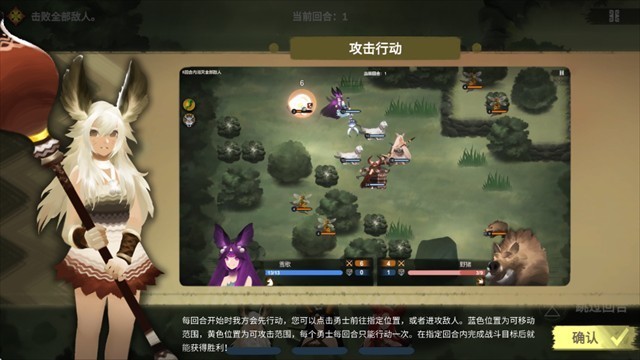 2、每回合由我方先手,玩家可选择角色移动或攻击。蓝色区域表示可移动范围,黄色区域代表攻击范围,每名角色每回合仅能执行一次操作。在规定回合内完成任务目标即可通关。