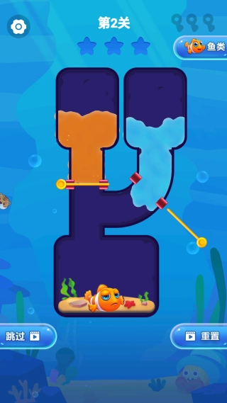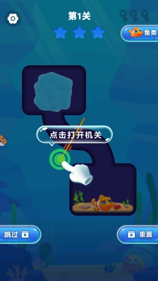 1、点击开始游戏,你将置身于氛围良好的益智解谜关卡,通过操作帮助小鱼脱困,游戏效果出色。