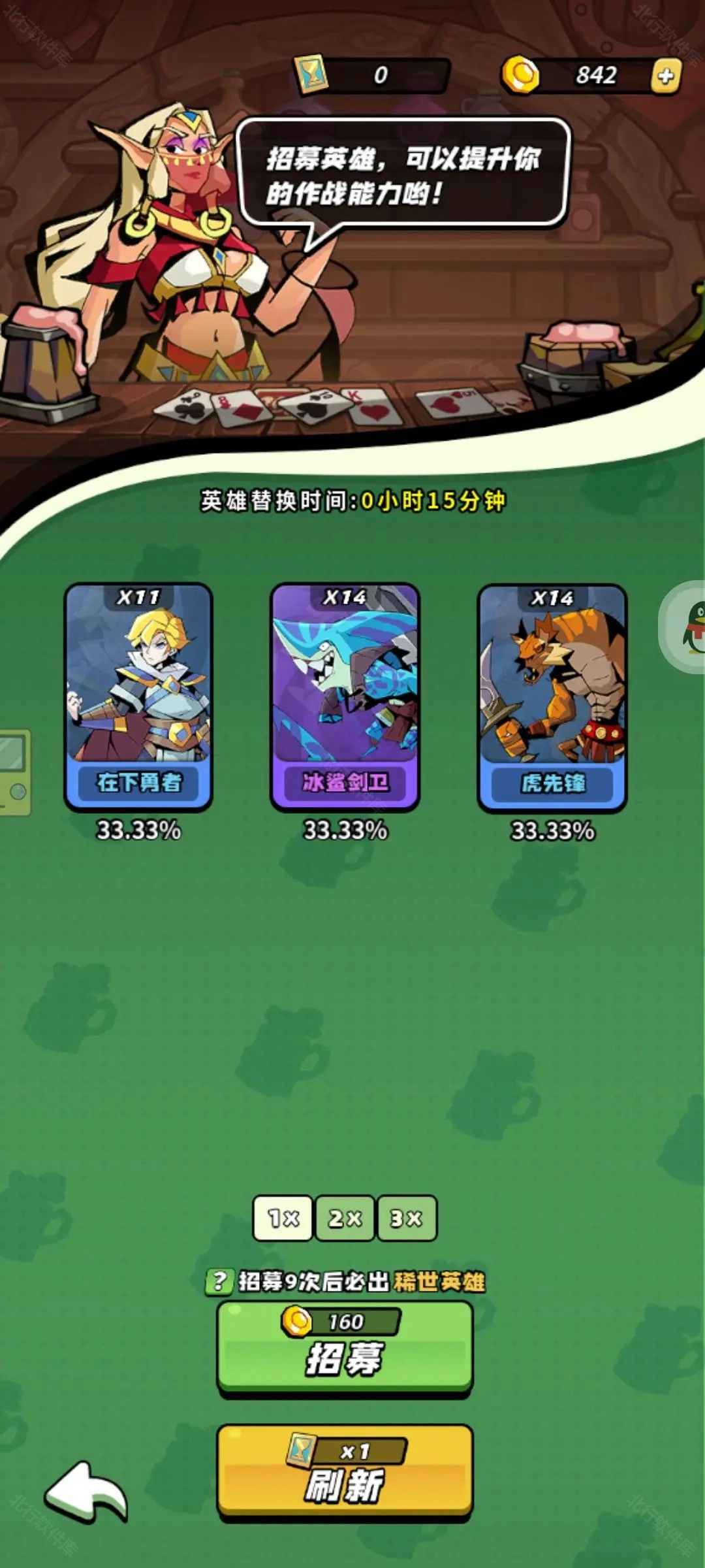 3、酒馆写着招募九次后必出橙色英雄,不一定要花金币招募,建议等刷新,半小时刷新一次,每次都有14%左右的概率出橙色,所以我们可以省着金币等出了橙色英雄后再招募。