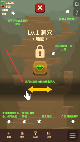2、进入后可以通过拖拽操作移动洞穴位置,从而查看不同区域,并且能够查看宝石的状态,掌握挖掘的进展情况。