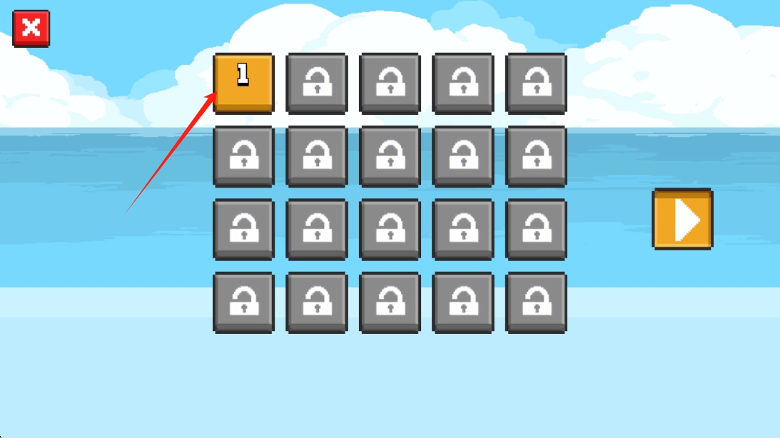2、关卡选择:点击数字“1”对应的关卡,即可进入第一关,准备开启冒险挑战;通过点击按钮来选定当前要玩的游戏关卡。
