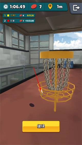 3、在游戏场景内完成飞盘投掷等操作,待飞盘入框后,点击界面下方的黄色“继续”按钮。