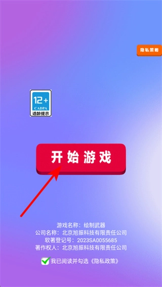 1、勾选隐私政策后点击开始游戏按钮,可进入游戏核心玩法,开启绘制武器玩法的基础操作,可体验图案绘制、战斗内容。